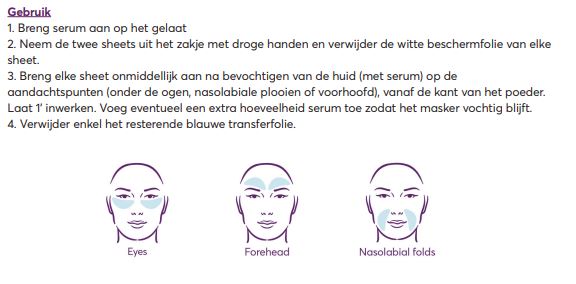 Dit masker verbetert onmiddellijk en zichtbaar het uiterlijk van de huid en biedt stevigheid en hydratatie. Sheets te gebruiken op oogcontour, nasolabiale plooien of verticale lijnen.